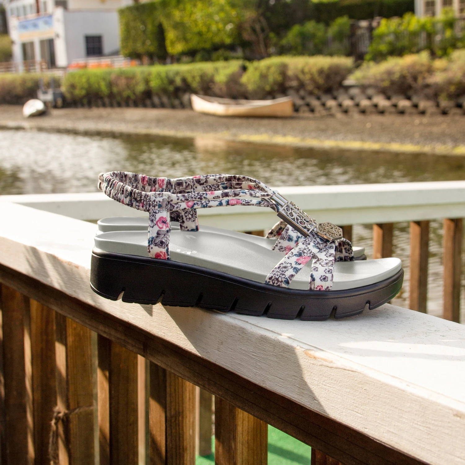 Featured in a floral printed Lovely Grey design on a leather upper, this t-strap sandal has all the chic boho appeal your summer outfits are looking for.
